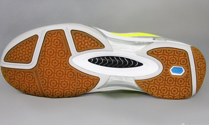 凱勝FYZH005-1羽毛球鞋鞋底的設計采用了兩種紋路,回字形和人字形的紋路?;刈中蔚募y路在球鞋制動和停止時能像多個方向運動。而中底則采用的是第一代酷風戰靴的中底透氣孔,兩側的TPU硬支撐再次增加中底強度。球鞋的透氣窗,鞋舌的大網布,再加上中底的透氣窗。組成了RUNNING AIR空氣流動系統。使得球鞋更加的保持清爽。