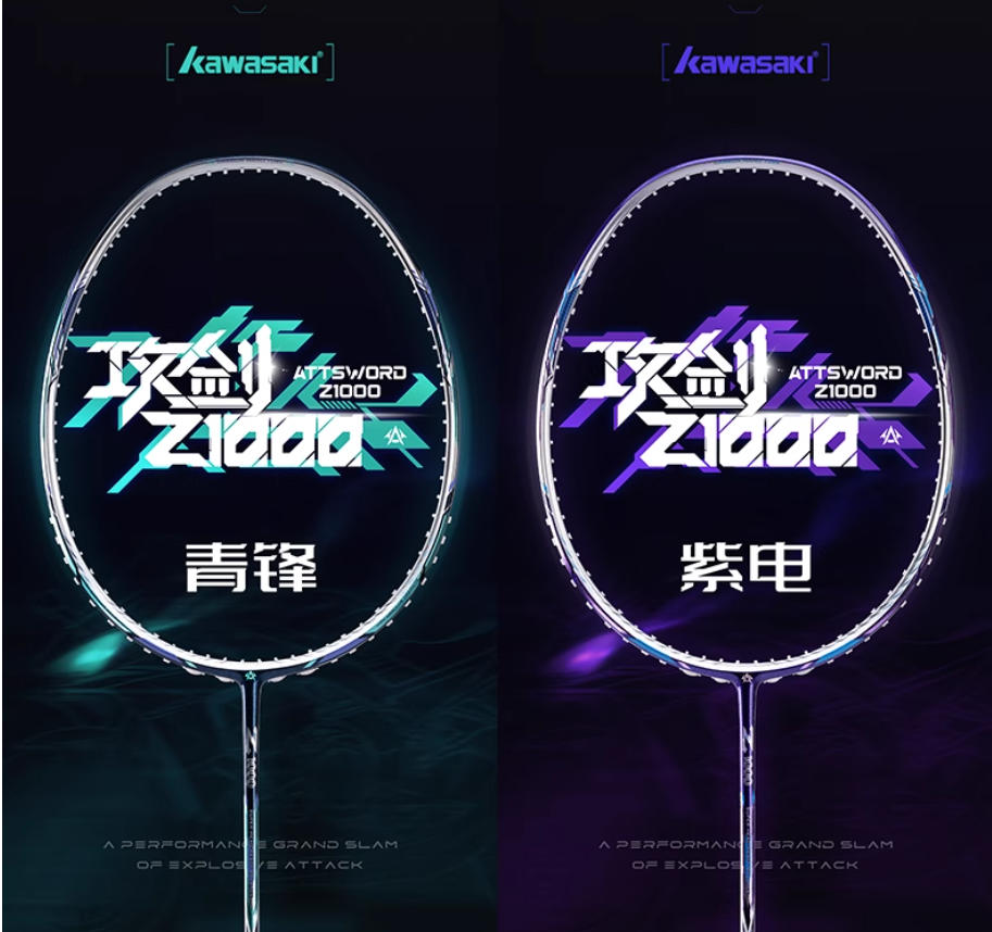 川崎 Kawasaki 攻劍Z1000 羽毛球拍新品上市, 性能滿貫,狂飆進攻,川崎這款Z1000新拍重量未4U,拉線磅數可以達到35磅,被稱為“球場重炮手”,川崎攻劍Z1000分為四個顏色,一個青峰,一個紫電、焚天、冰魄,川崎的配色比較青春艷麗,這款也不例外。