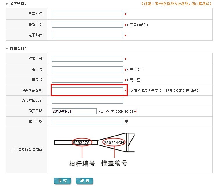 注:帶星號的為必填項,每支球拍桿號限填寫一次,請勿重復填寫!