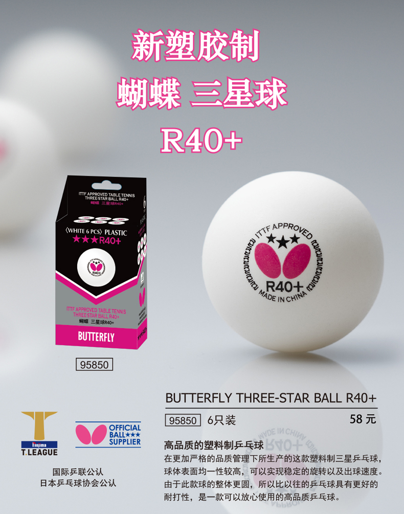 - 商品名稱:BUTTERFLY蝴蝶 R40+新材料乒乓球 高品質 更圓 6個裝